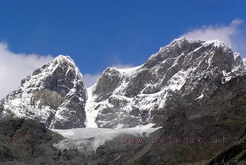 ![]() sullo sfondo il gruppo del Bernina, qui la cresta Guzza, il canalone Folatti e il Piz Argent ( il Rogeg se metti il mouse) |